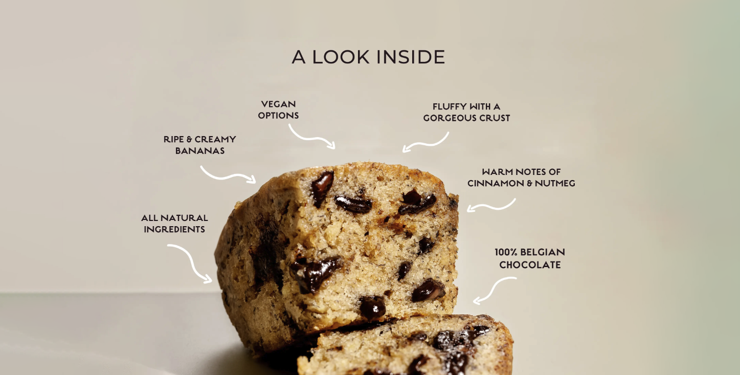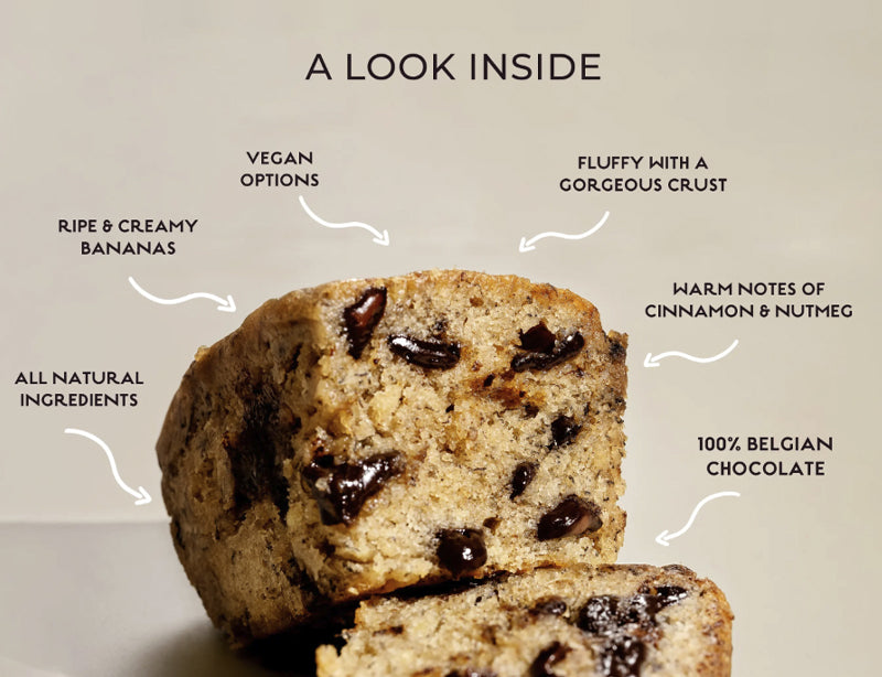 The ultimate banana bread made with creamy bananas, warm spices and infused with fine Belgian Chocolate Chips. The taste experience you've been waiting for.